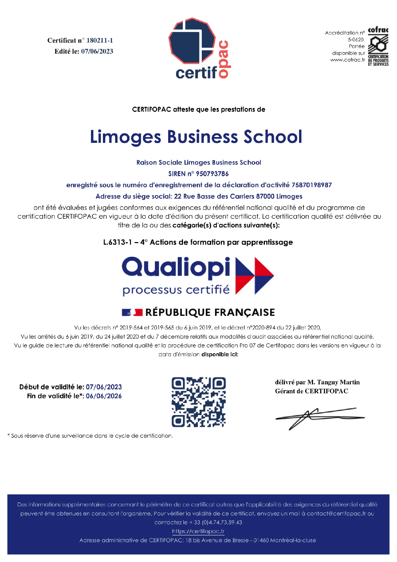 À la Limoges Business School, nous sommes dédiés à l'excellence et à la qualité dans toutes nos initiatives et notre enseignement. Nous sommes fiers de partager que notre institution a reçu la certification "Qualiopi", qui témoigne de la qualité de nos services.